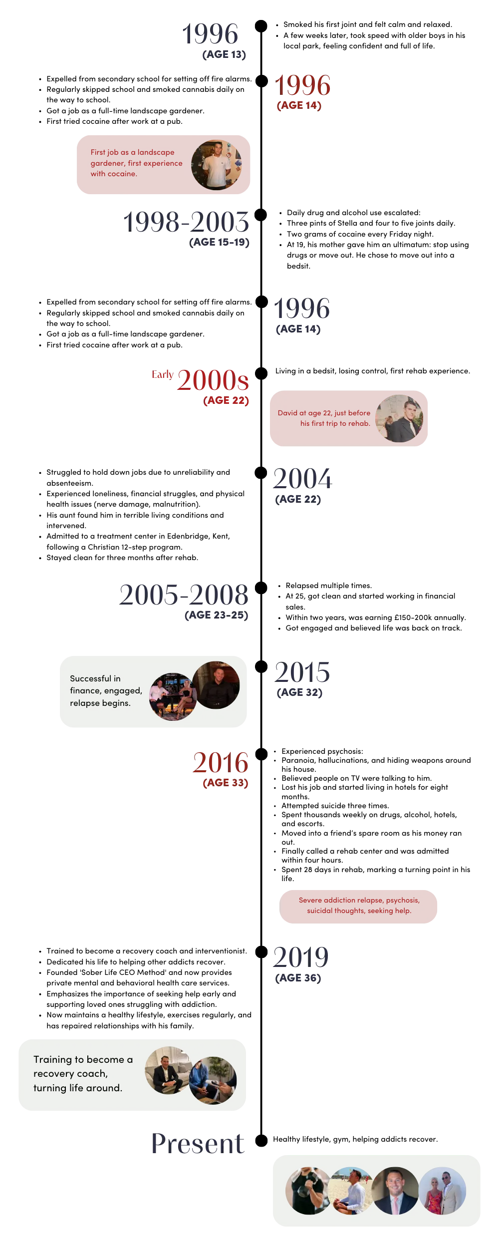 Today, as a recovery coach and interventionalist, I use my lived experience to help others break free from addiction and rebuild their lives. This timeline outlines the key moments that shaped my journey—from addiction to recovery, and ultimately, to a life dedicated to helping others find their own way forward.